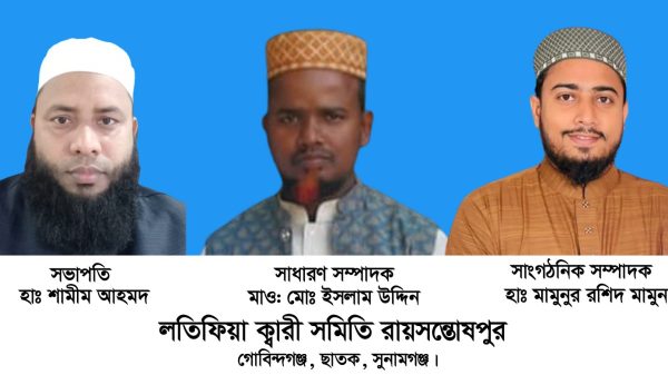 দিলোয়ার হোসেন, ছাতক,প্রতিনিধিঃ দৈনিক জনপদের নিউজ:সভাপতি মোঃ শামীম আহমেদ, সম্পাদক মোঃ ইসলাম উদ্দিন, সাংগঠনিক সম্পাদক মামুন রায়সন্তোষপুর লতিফিয়া ক্বারী সমিতি’র কাউন্সিল অনুষ্ঠান অদ্য ৩১জানুয়ারী ২৫ইং শুক্রবার,বাদ মাগরিব অনুষ্ঠিত হয় উক্ত