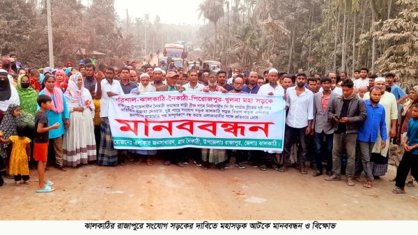হাসিবুর রহমান,রাজাপুর (ঝালকাঠি) প্রতিনিধি দৈনিক জনপদের নিউজঃঝালকাঠির রাজাপুরের নৈকাঠি জোমাদ্দার বাড়ি এলাকার নির্মানাধীন সেতুর দু’পাশের ৪ টি সড়কের সংযোগ সড়ক নির্মানের দাবিতে খুলনা-বরিশাল আঞ্চলিক আটকে মানববন্ধন ও বিক্ষোভ করেছে এলাকাবাসী।